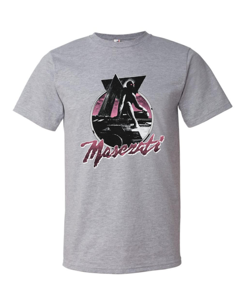 Sci-fi VHS tape-inspired design celebrating Maserati’s 2015 album of the same name. Three-color ink on Anvil 980 Athletic Heather.